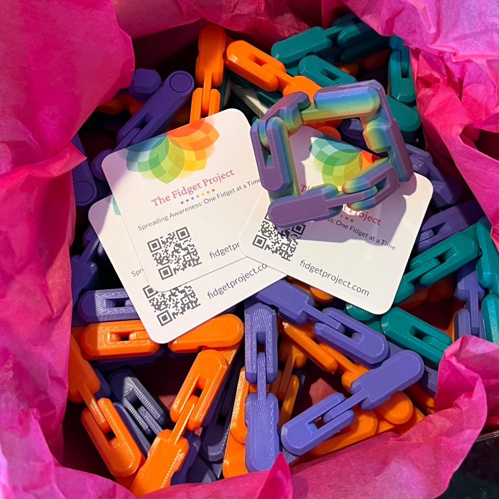 We usually print for speed since our fidgets are distributed to adults, but knew we needed to make some changes for classroom use. We scaled the fidgets larger and used a sturdier PLA+ filament. After a few days of running the P1P, we had a nice collection packed up for this amazing teacher.